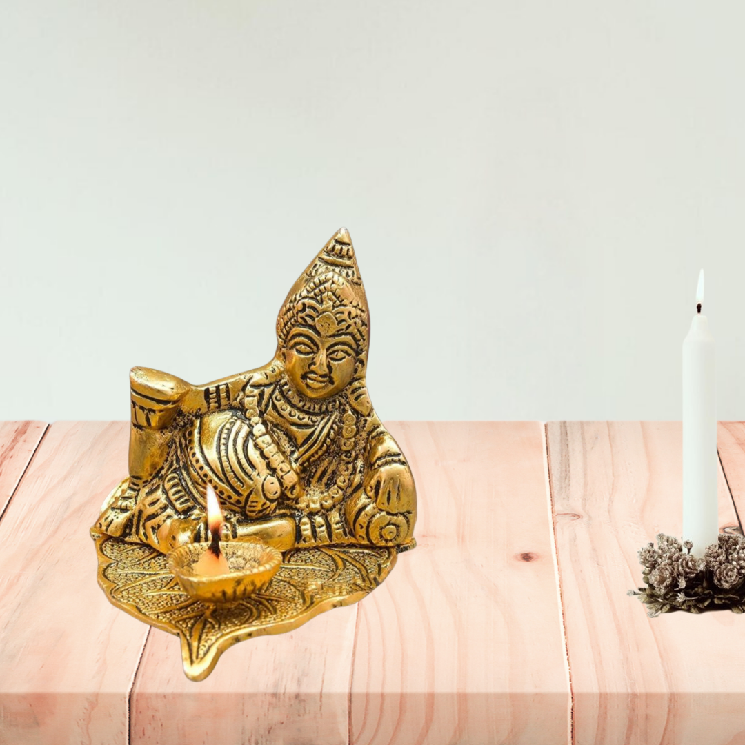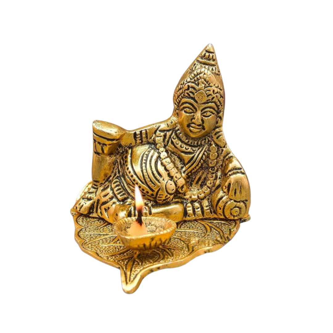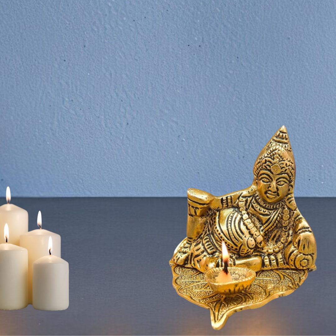 Handcrafted Lord Kuber Sitting on Leaf with Diya